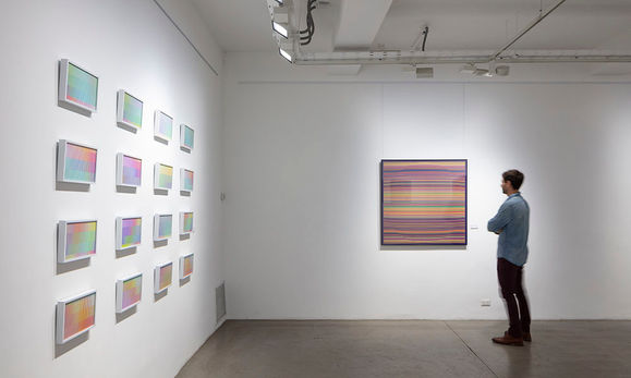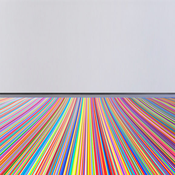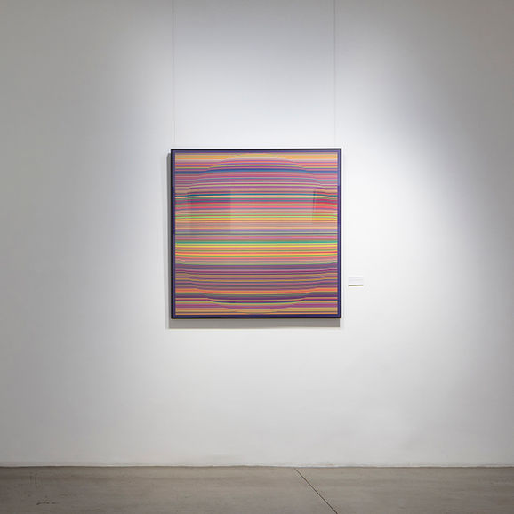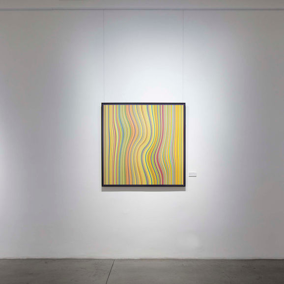 Partiendo de una estructura periódica compuesta por franjas de color sólido y saturado dispuestas en una superficie plana, el artista interviene en la totalidad de la obra para inducir una deformación. Esta transformación brinda una oportunidad para explorar las posibilidades cromáticas y la tensión que emerge al contrastar simultáneamente la intensidad y periodicidad del color con la fluidez inestable de las formas.